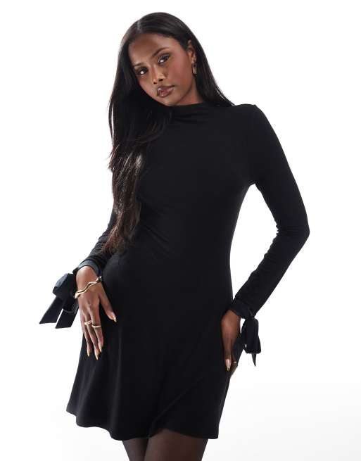 Miss Selfridge – Hochgeschlossenes, ausgestelltes Kleid in Schwarz mit Schleife aus Satin