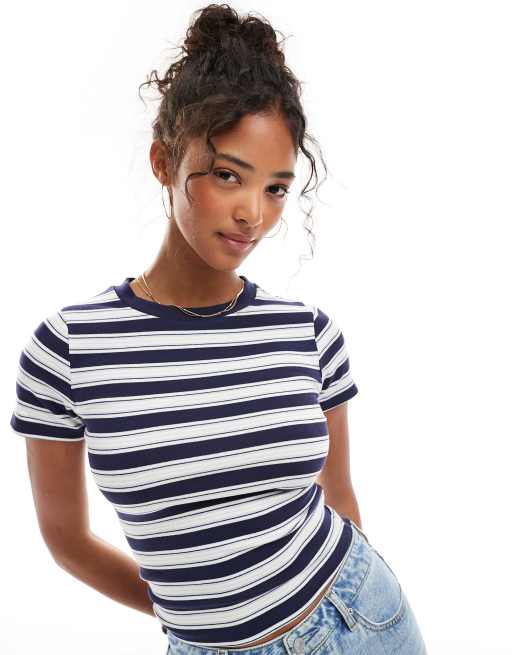 Miss Selfridge – Knapp geschnittenes T-Shirt mit Streifen in Marineblau
