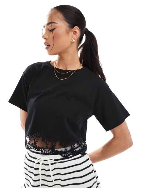 Miss Selfridge – Kurzärmliges T-Shirt in Schwarz mit Spitzensaum