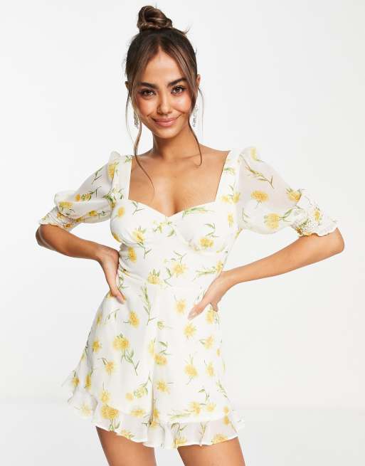 Miss Selfridge – Kurzer Chiffon-Jumpsuit mit Sonnenblumenmuster und Detail im Brustbereich