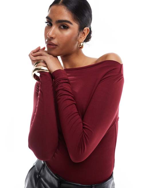 Miss Selfridge – Langärmliges Oberteil in Burgunderrot mit U-Boot-Ausschnitt