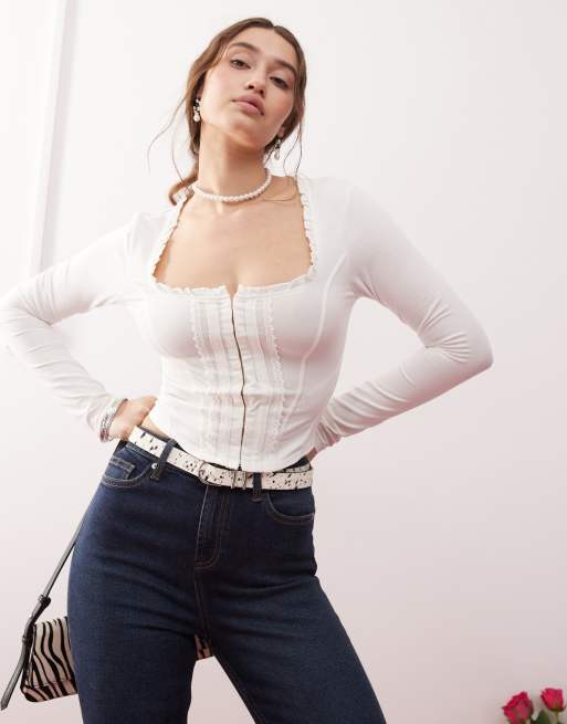 Miss Selfridge – Langärmliges Oberteil in Cremeweiß mit Korsettdetail