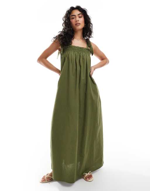Miss Selfridge – Langes Hängerkleid aus Popeline in Olivgrün mit Trägern