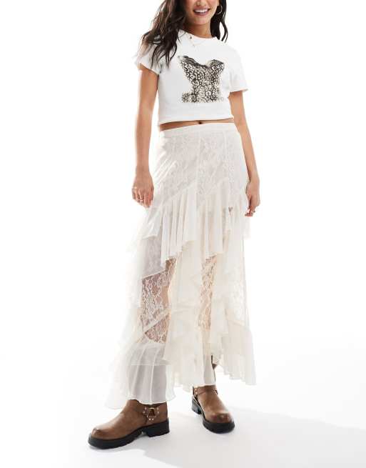 Miss Selfridge – Maxirock aus Spitze und Chiffon in Elfenbeinweiß