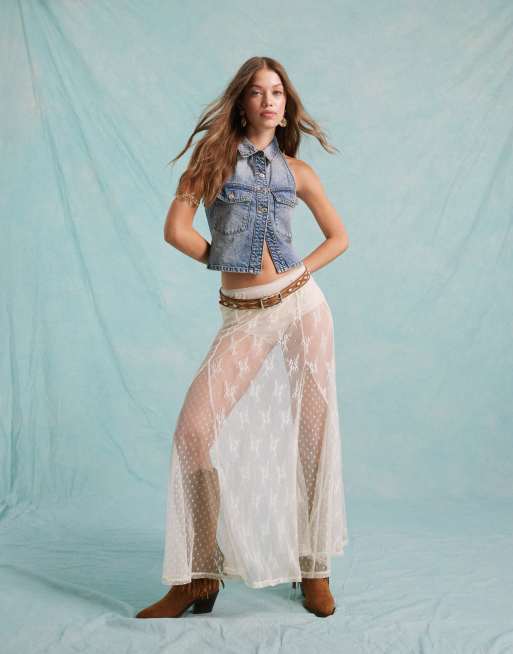 Miss Selfridge – Maxirock aus transparenter Jerseyspitze in Creme mit Godet-Details