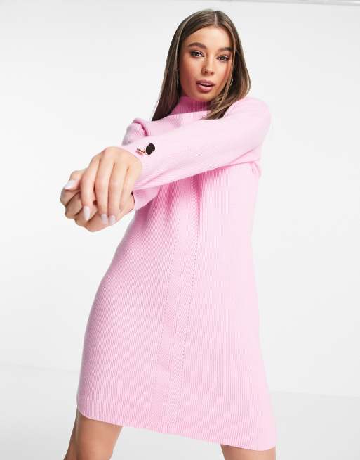 Miss Selfridge – Midi-Strickkleid in Rosa mit Bindegürtel und Stehkragen
