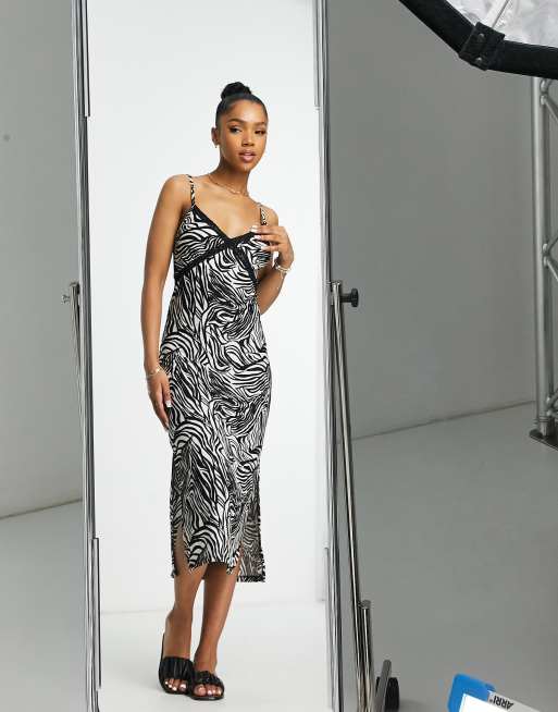 Miss Selfridge – Midi-Trägerkleid mit Spitzenbesatz und Zebradruck