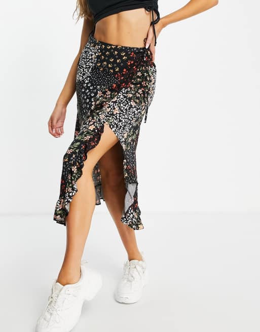 Miss Selfridge – Midi-Wickelrock mit Rüschen und Patchwork-Blumenmuster
