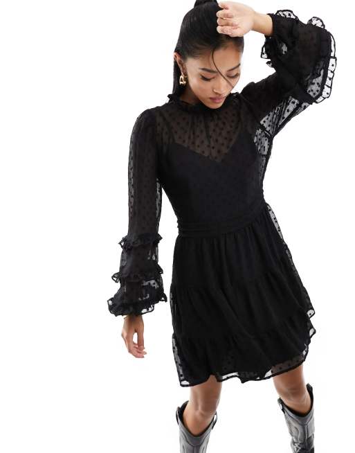 Miss Selfridge – Minikleid aus Dobby-Chiffon in Schwarz mit Rüschen