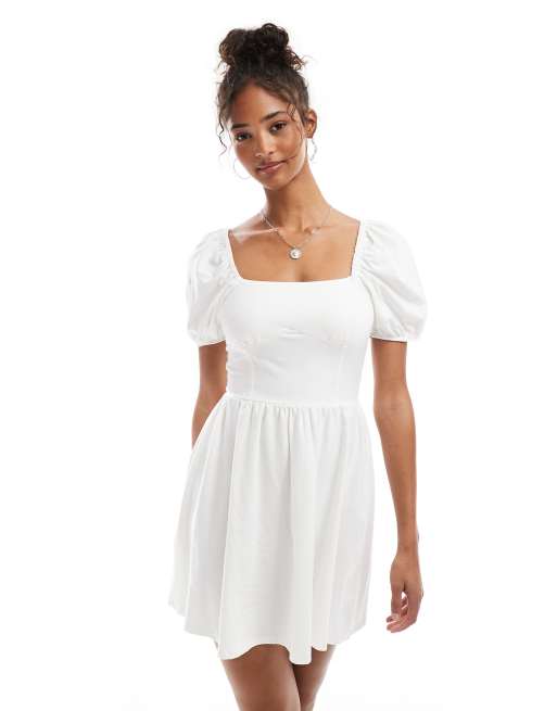 Miss Selfridge – Minikleid in Weiß mit Puffärmeln und Milchmädchen-Dekolleté