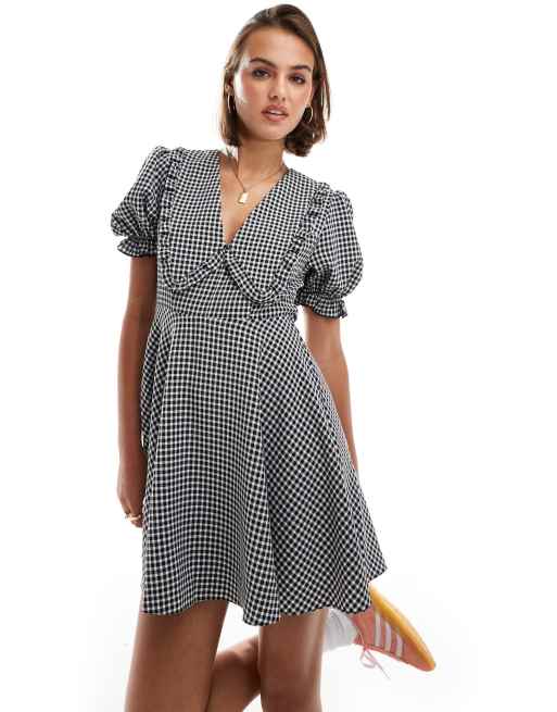 Miss Selfridge – Minikleid mit Kragen und Vichy-Karo in Schwarz-Weiß