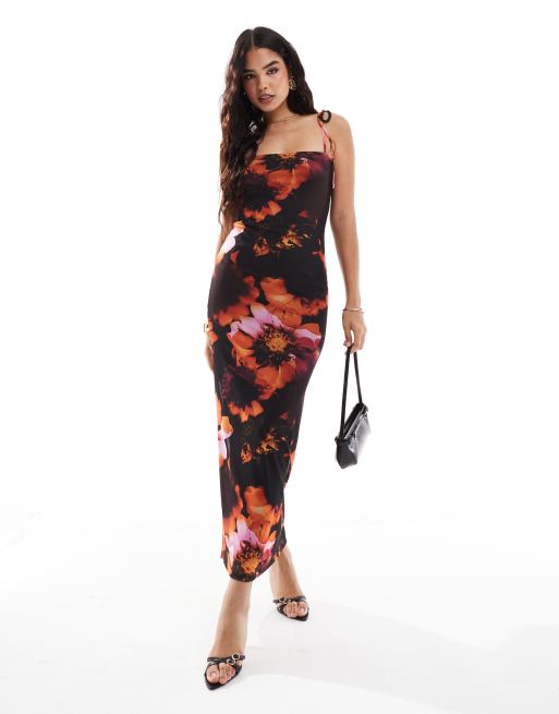 Miss Selfridge – Netzstoff-Maxikleid mit gebundenen Trägern und Blumenmuster