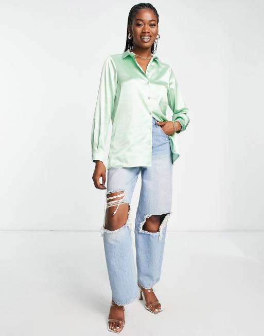 Miss Selfridge – Oversize-Satinhemd in Hellgrün mit Strassknöpfen