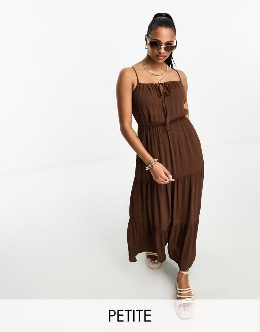 Miss Selfridge Petite – Strukturiertes Maxi-Sommerkleid in Schokoladenbraun mit Riemchenträgern und gesmokter Taille