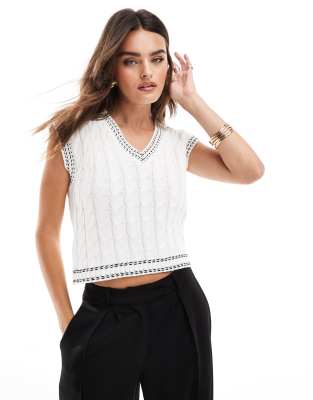 Miss Selfridge – Strick-Pullunder in Cremeweiß mit Zierstreifen und Zopfmuster