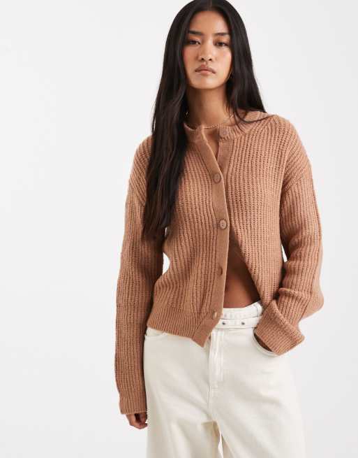 Miss Selfridge – Strickjacke in Camel mit breiter Rippenstruktur und Rundhalsausschnitt