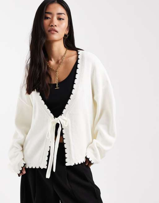 Miss Selfridge – Strickjacke in Creme mit Languettenstich und Bindedetail