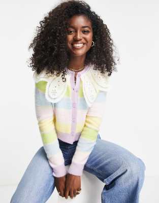Miss Selfridge – Strickjacke in Regenbogenfarben mit Kragendetail