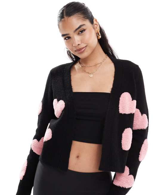 Miss Selfridge – Strukturierte Strickjacke in Schwarz mit rosa Herzmuster