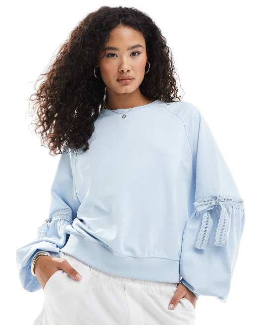 Miss Selfridge – Sweatshirts in Staubblau mit Ballonärmeln und Schleifen