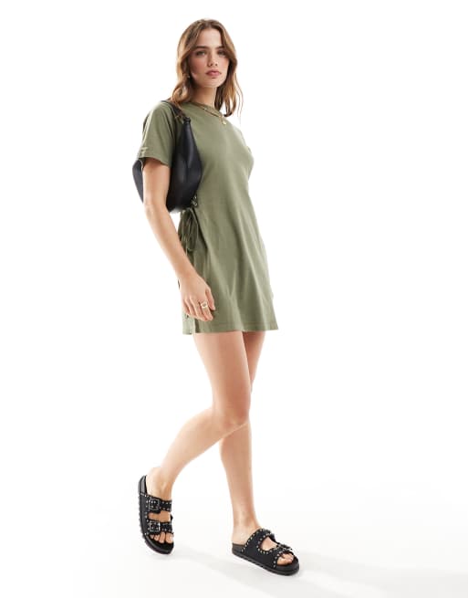 Miss Selfridge – T-Shirt-Minikleid in verwaschenem Khaki mit seitlichen Bindebändern