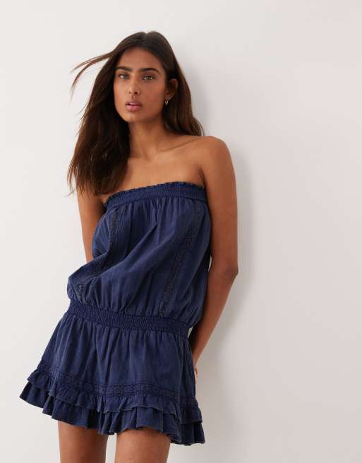 Miss Selfridge – Trägerloses Jeanskleid in blauer Waschung