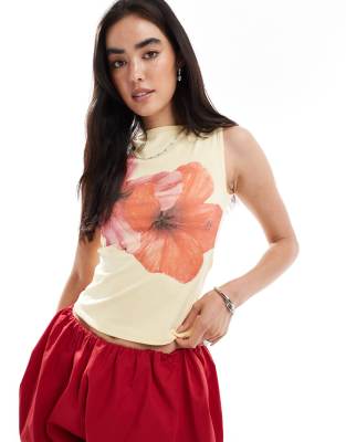 Miss Selfridge – Trägertop in Buttergelb mit Racer-Ausschnitt und tropischem Orchideen-Motiv