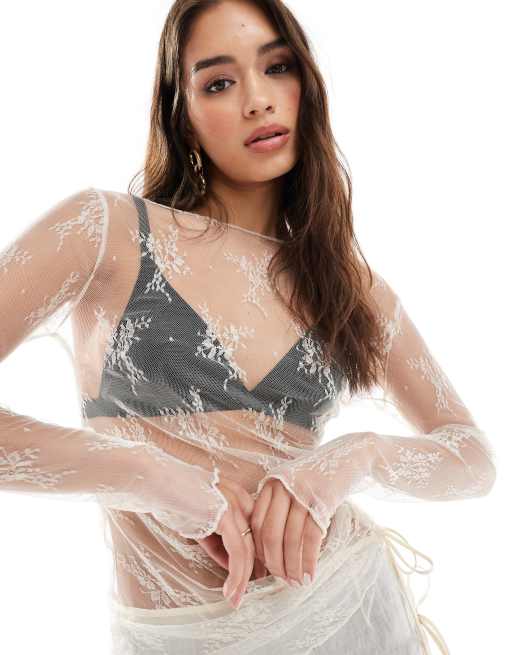 Miss Selfridge – Transparentes Oberteil aus Jersey und Spitze in Cremeweiß mit Carmen-Ausschnitt