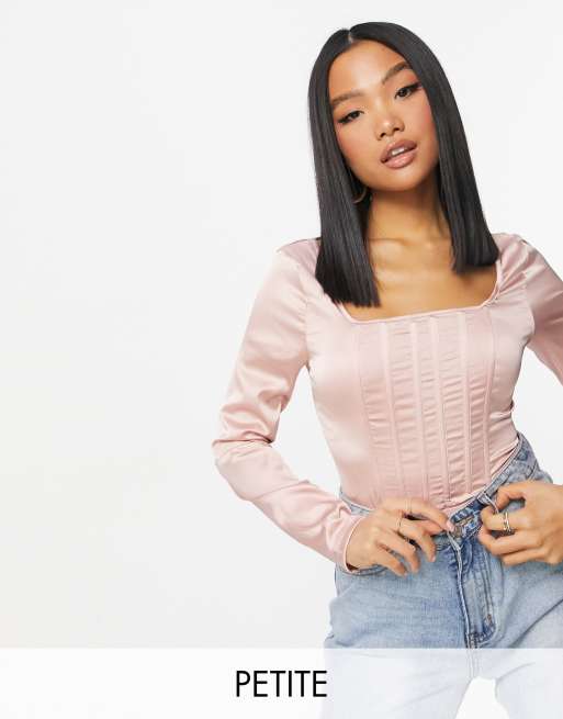 Missguided Petite – Langärmliger Body mit Korsett-Detail aus Satin in Rosa