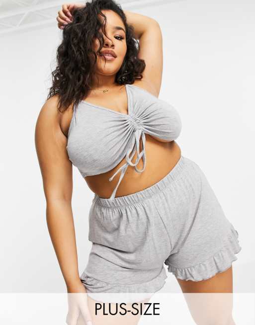 Missguided Plus – Pyjama in Grau mit Camisole und gerüschten Shorts