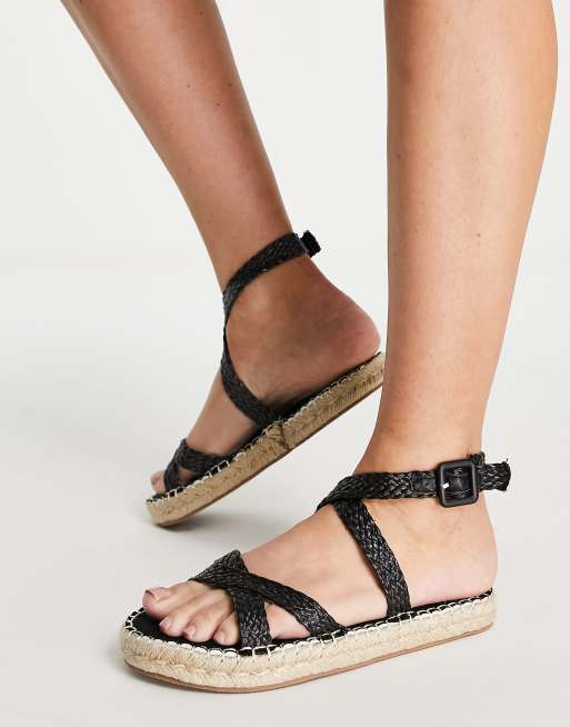 Missguided – Flache Bast-Sandalen mit überkreuztem Design in Schwarz