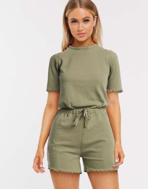Missguided – Kurzer Jumpsuit in Khaki mit gerafftem Saum