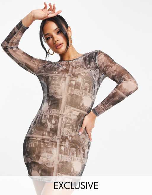 Missguided – Minikleid aus Netzstoff in Braun mit Grafik-Print