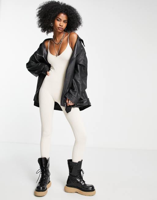 Missy Empire – Gerippter, nahtloser Riemchen-Jumpsuit in Creme