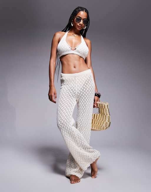 Missy Empire – Gestricktes Strand-Set in Cremeweiß, aus Bustier mit gebundener Rückseite und weit geschnittener Hose