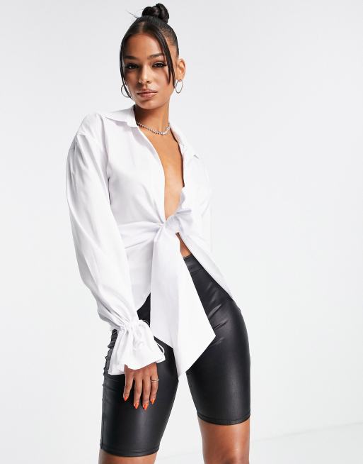 Missy Empire – Hemd in Weiß mit tiefem Ausschnitt und drapiertem Detail
