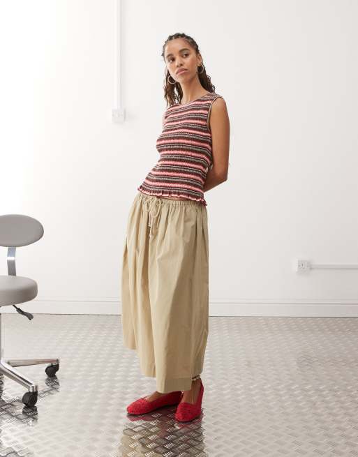 Monki – Ärmelloses, gesmoktes Hänger-Tanktop in Braun gestreift mit Rüschensaum