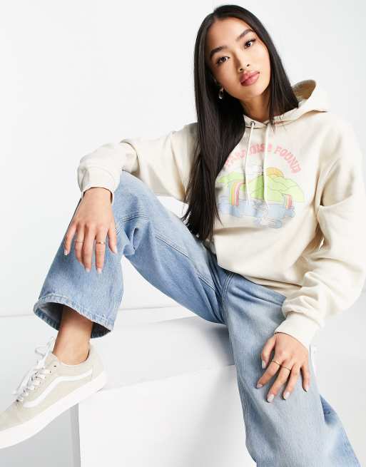 Monki – Baumwoll-Kapuzenpullover in Beige mit Schriftzug-Print - BEIGE