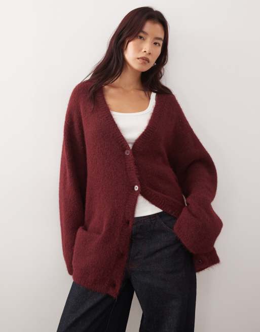 Monki – Flauschige Oversize-Strickjacke in Burgunderrot