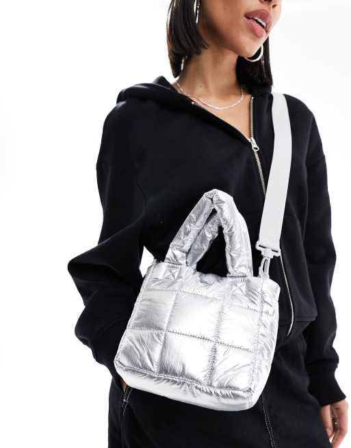 Monki – Gepolsterte, quadratische Mini-Tasche in Metallic-Silber mit Umhängeriemen