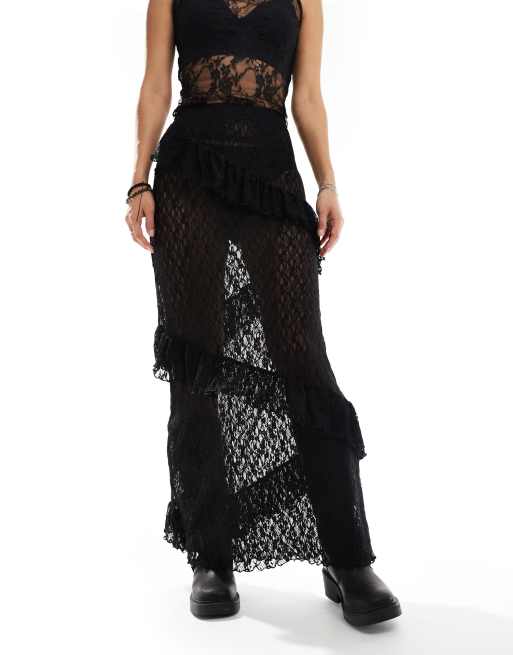 Monki – Gerüschter Maxirock aus Spitze in Schwarz
