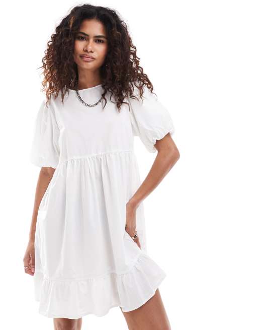Monki – Gesmoktes, kurzärmliges Minikleid in Weiß