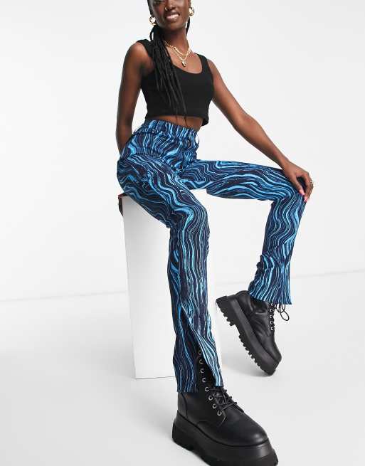 Monki – Hose mit blauem Wirbelprint und Schlitzen