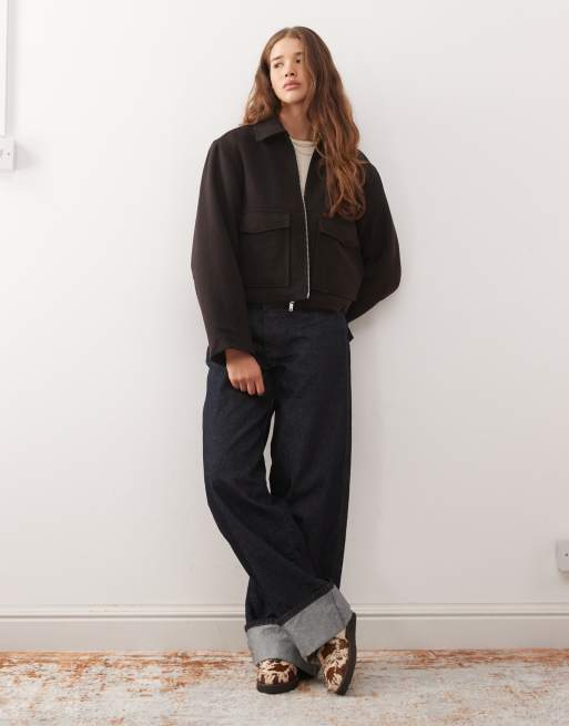 Monki – Jacke in Schokobraun mit kurzem Kragen und Wollanteil
