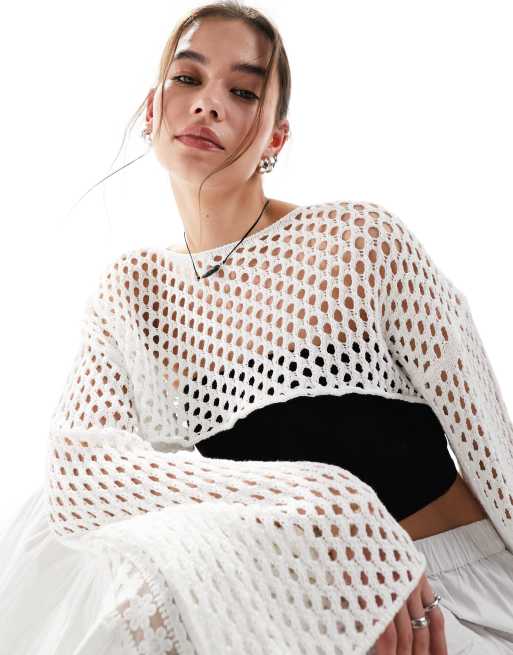 Monki – Langärmliger Bolero aus weitmaschigem Häkelmaterial in gebrochenem Weiß