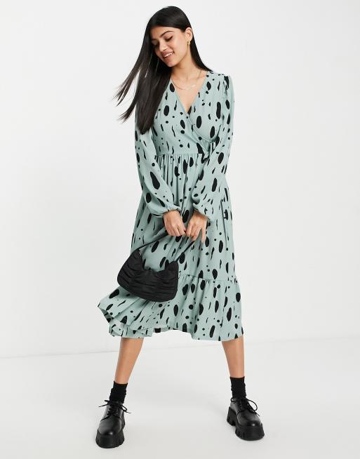 Monki – Langärmliges, gepunktetes Wickelkleid in Blau - MBLUE