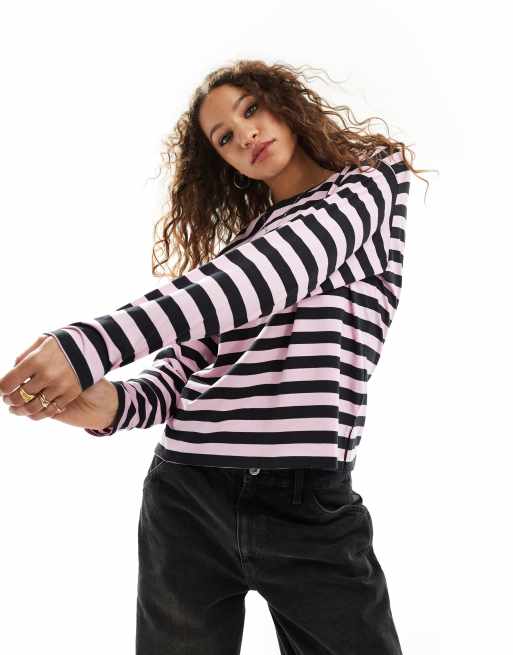 Monki – Langärmliges, gestreiftes Oberteil in Schwarz und Rosa