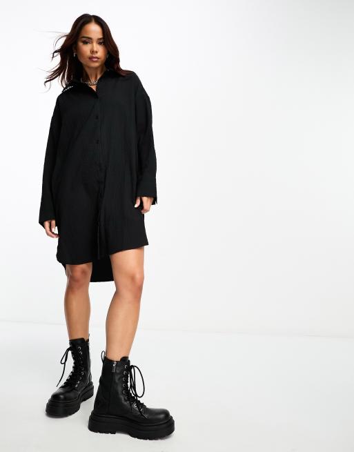 Monki – Langärmliges, kurzes Hemdblusenkleid in Schwarz