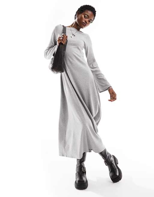 Monki – Langärmliges Maxikleid in Grau meliert mit U-Boot-Ausschnitt und weich fallendem Saum