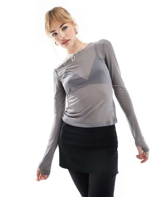 Monki – Langärmliges Oberteil aus Netzstoff in Anthrazitgrau